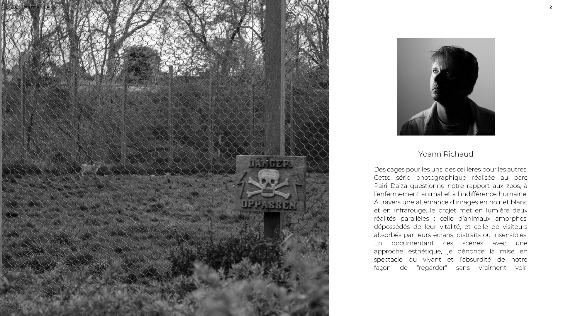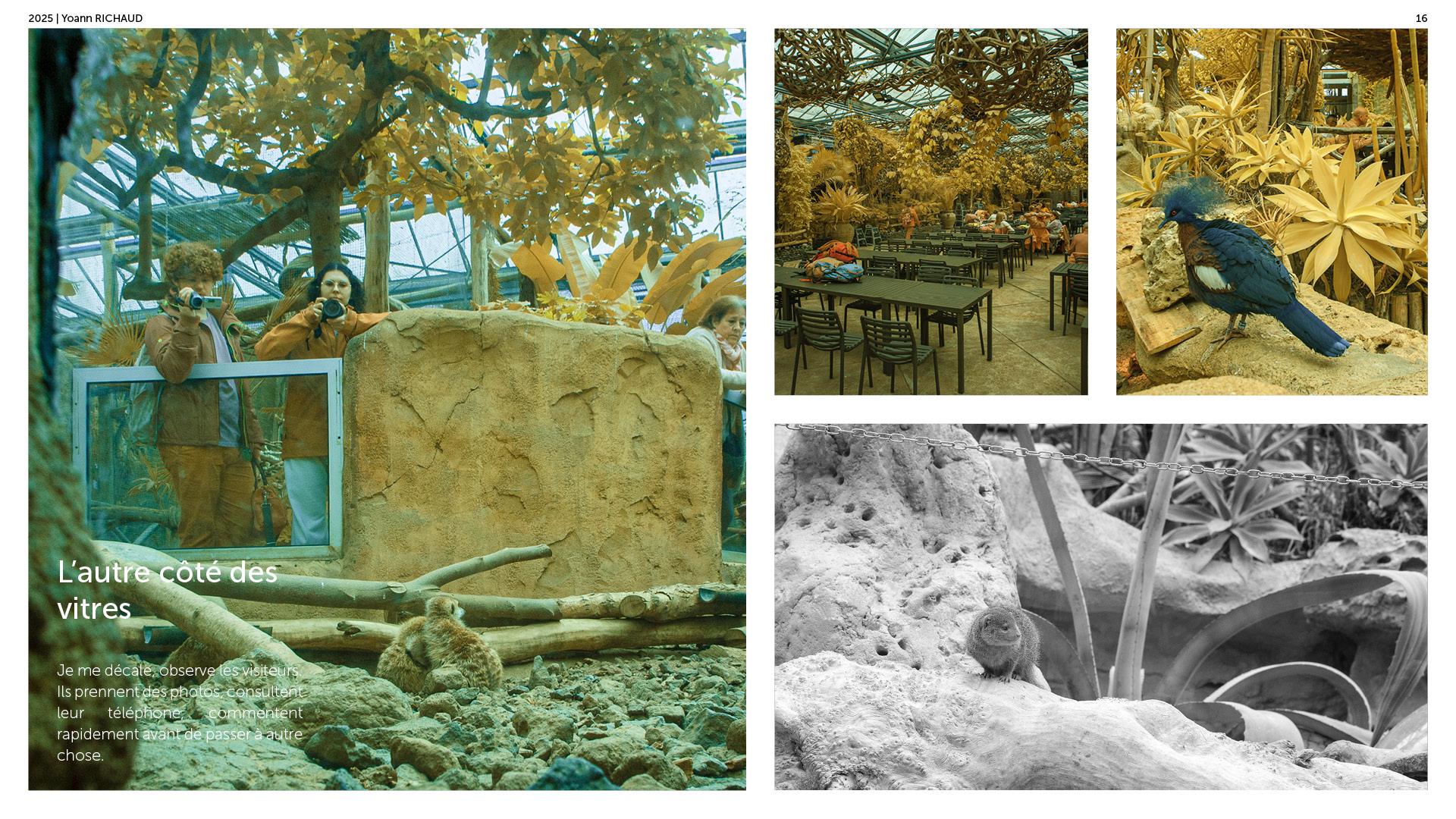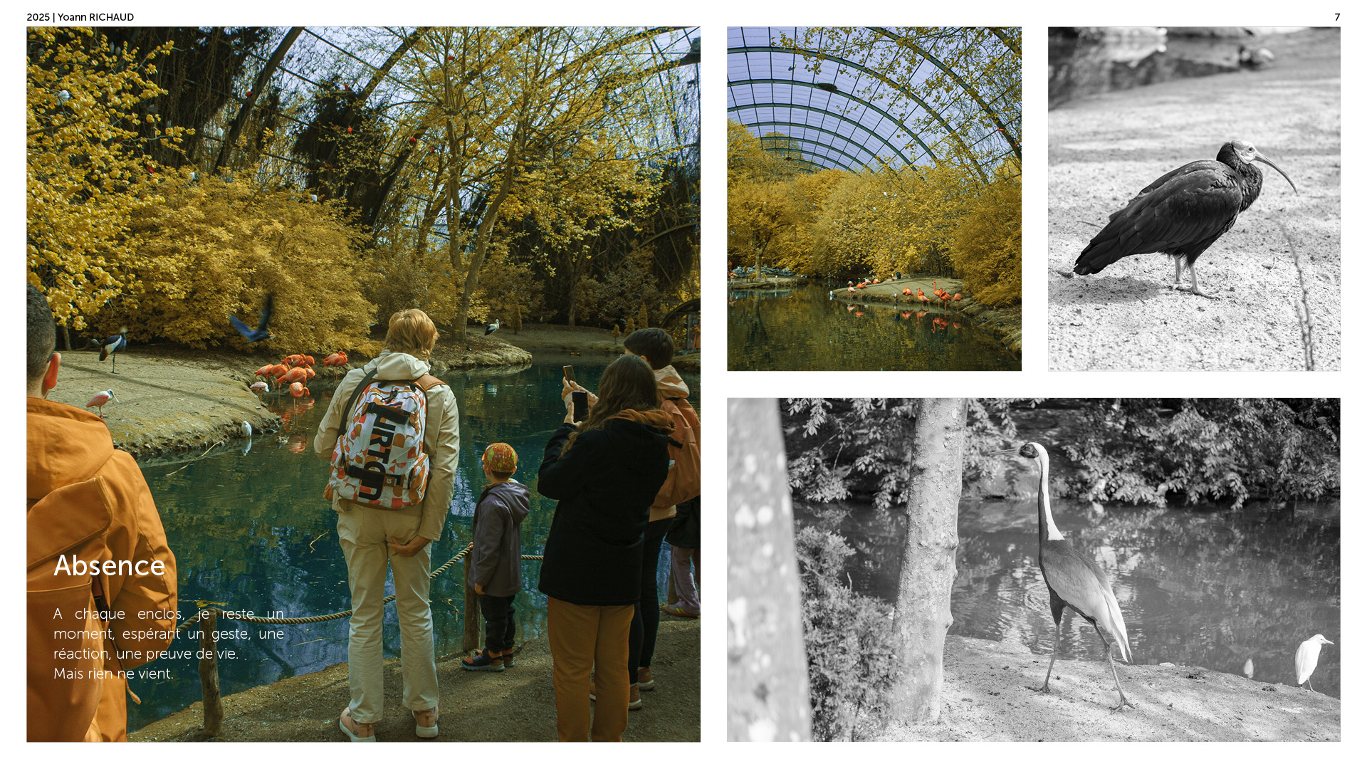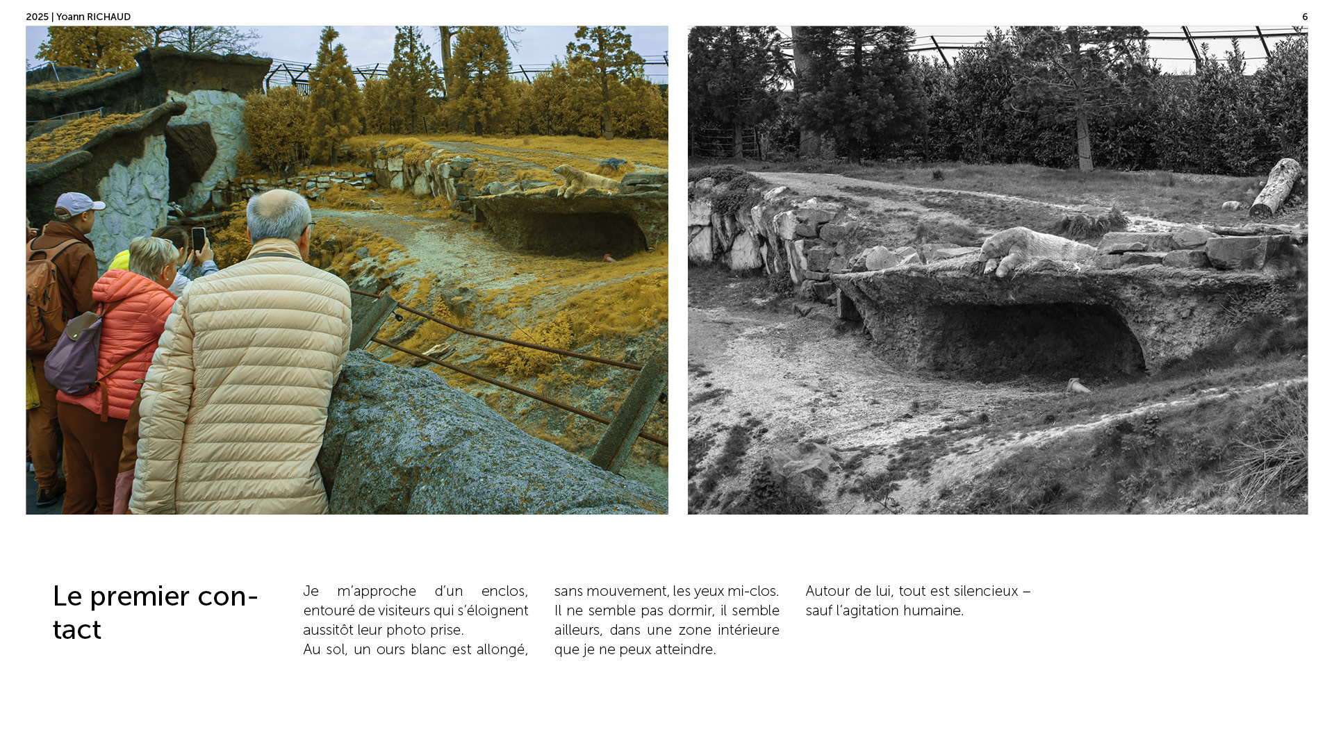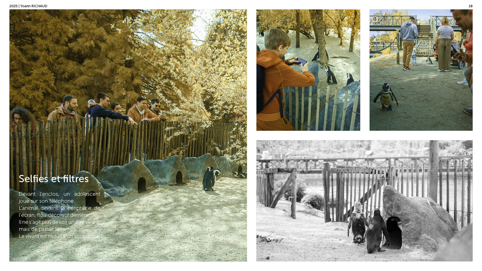 Photographe à Metz Cette série photographique réalisée au parc Pairi Daiza explore le contraste entre l’enfermement animal et l’indifférence humaine. Entre images en noir et blanc et vues en infrarouge, elle souligne deux réalités parallèles : celle d’animaux figés, et celle de visiteur·euses absorbé·es, détaché·es du vivant. En adoptant une esthétique soignée, ce projet invite à repenser notre rapport aux zoos et à notre façon de regarder.