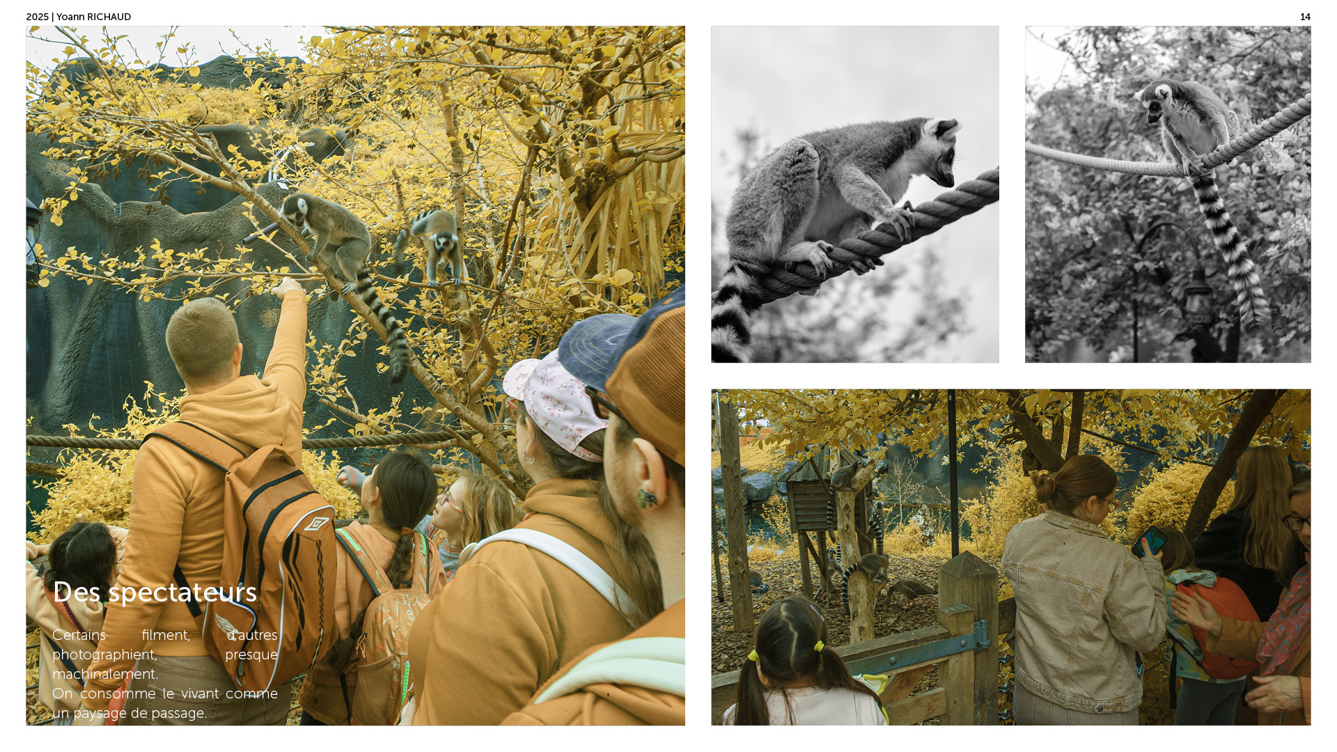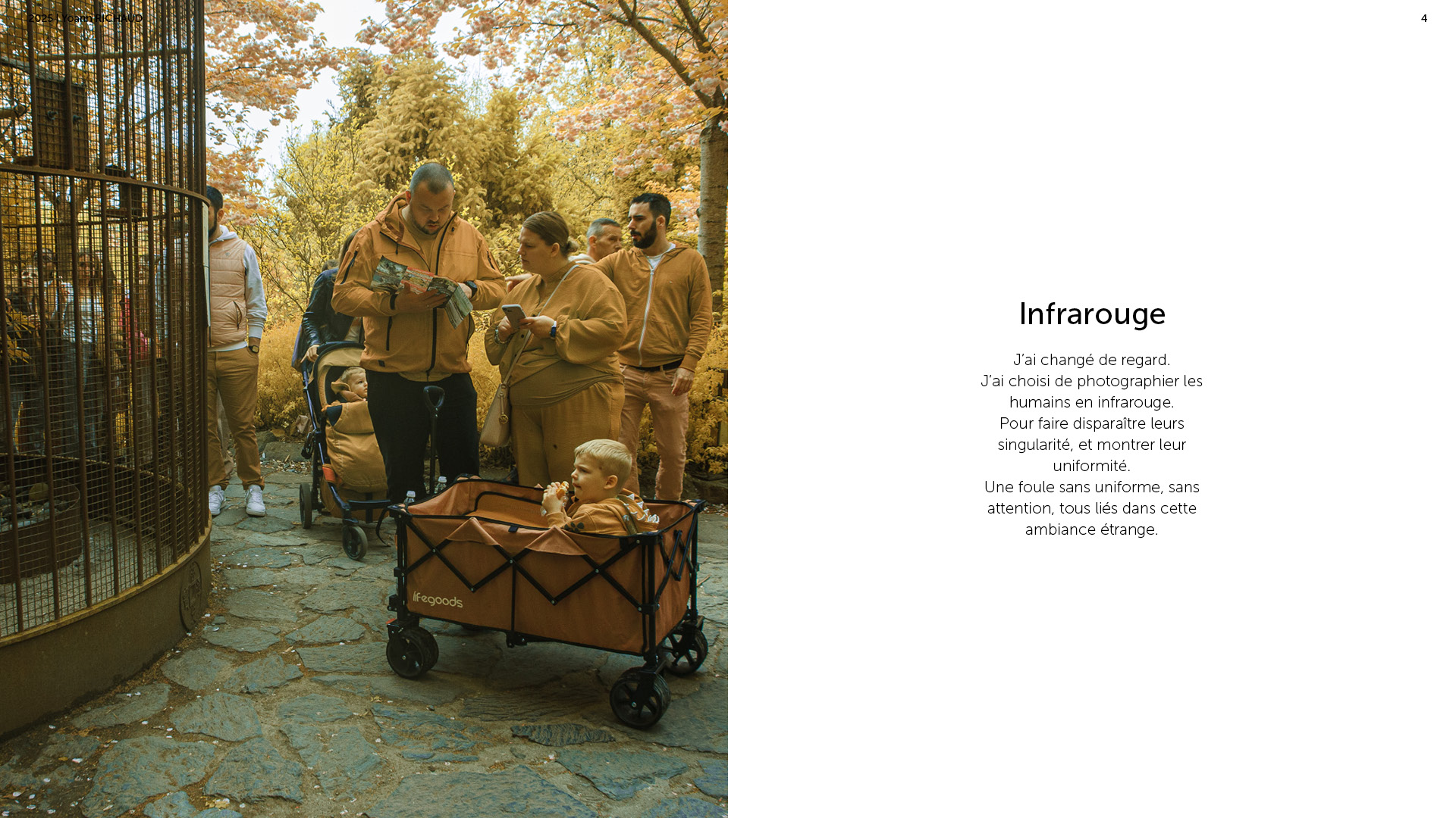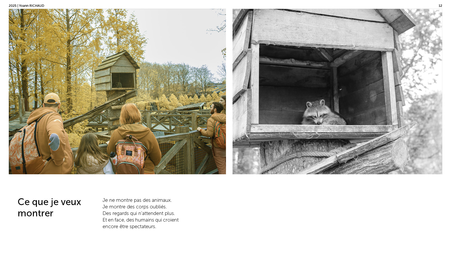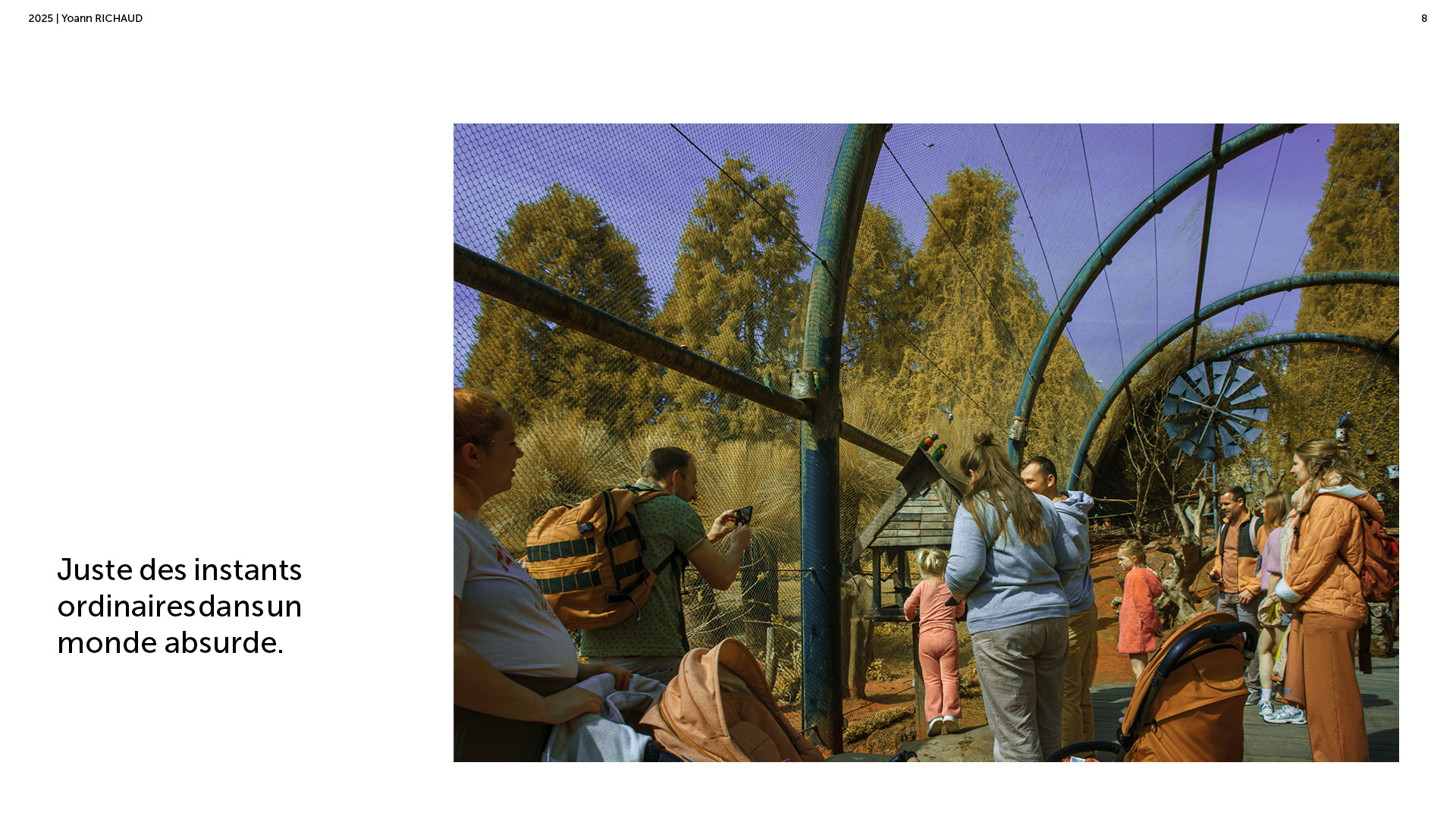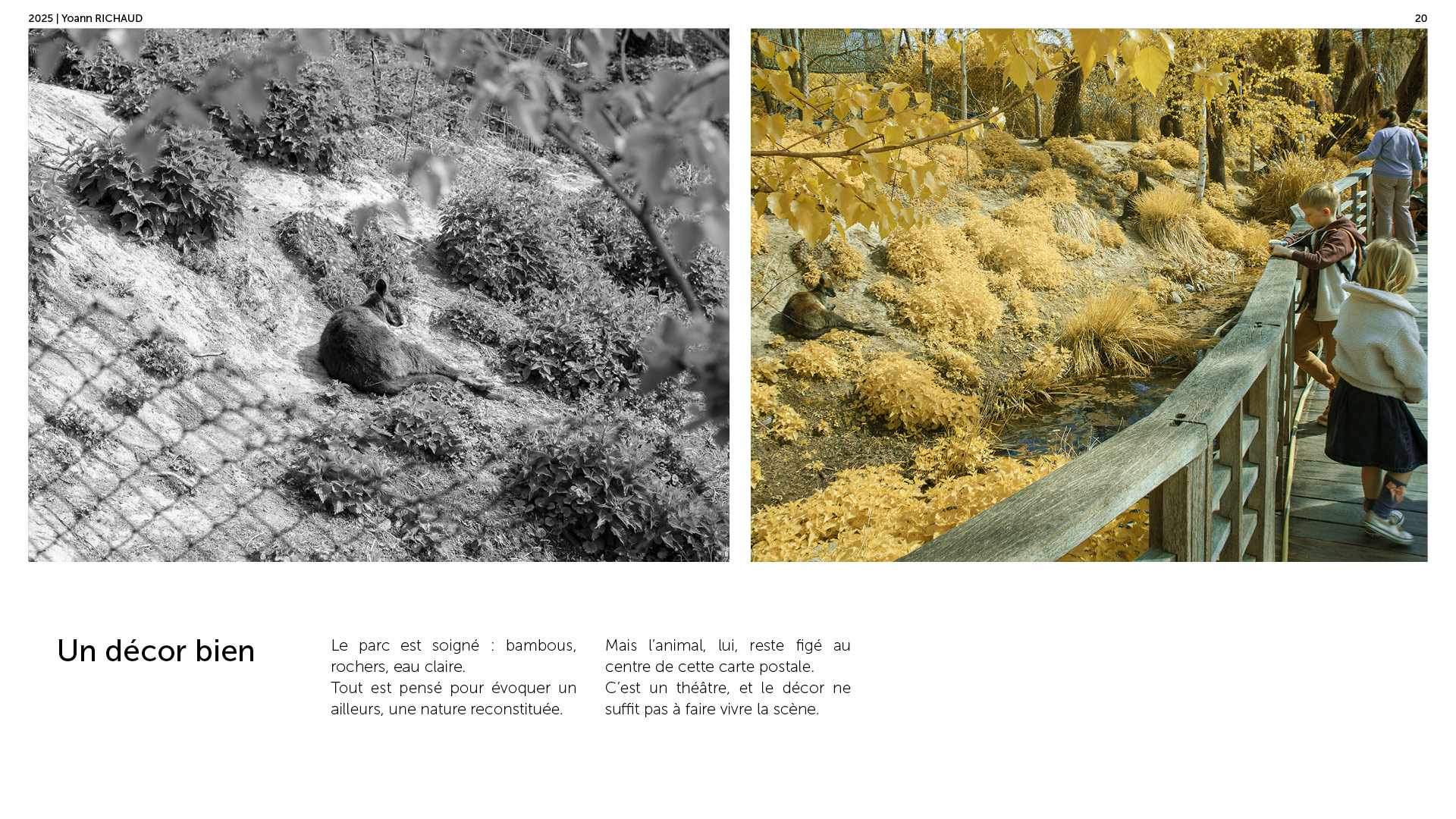 Photographe à Metz Cette série photographique réalisée au parc Pairi Daiza explore le contraste entre l’enfermement animal et l’indifférence humaine. Entre images en noir et blanc et vues en infrarouge, elle souligne deux réalités parallèles : celle d’animaux figés, et celle de visiteur·euses absorbé·es, détaché·es du vivant. En adoptant une esthétique soignée, ce projet invite à repenser notre rapport aux zoos et à notre façon de regarder.