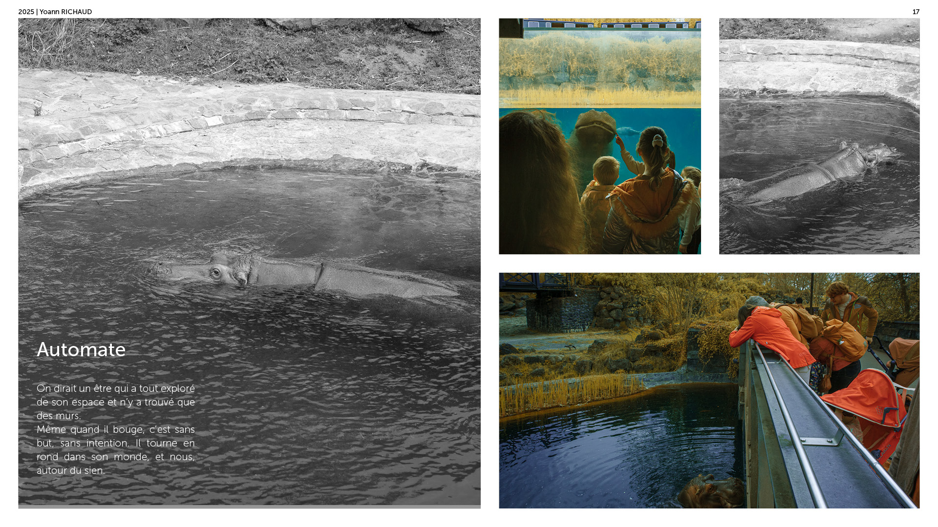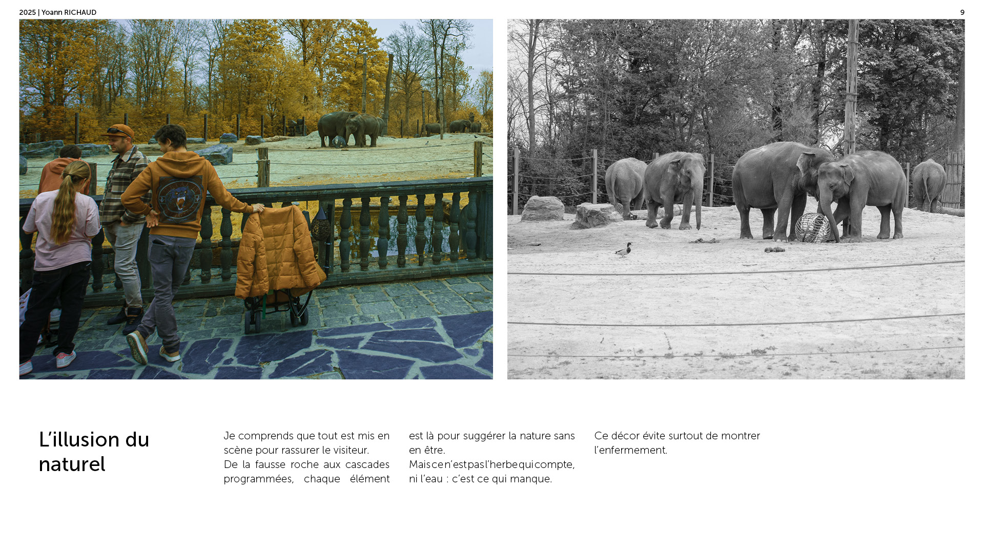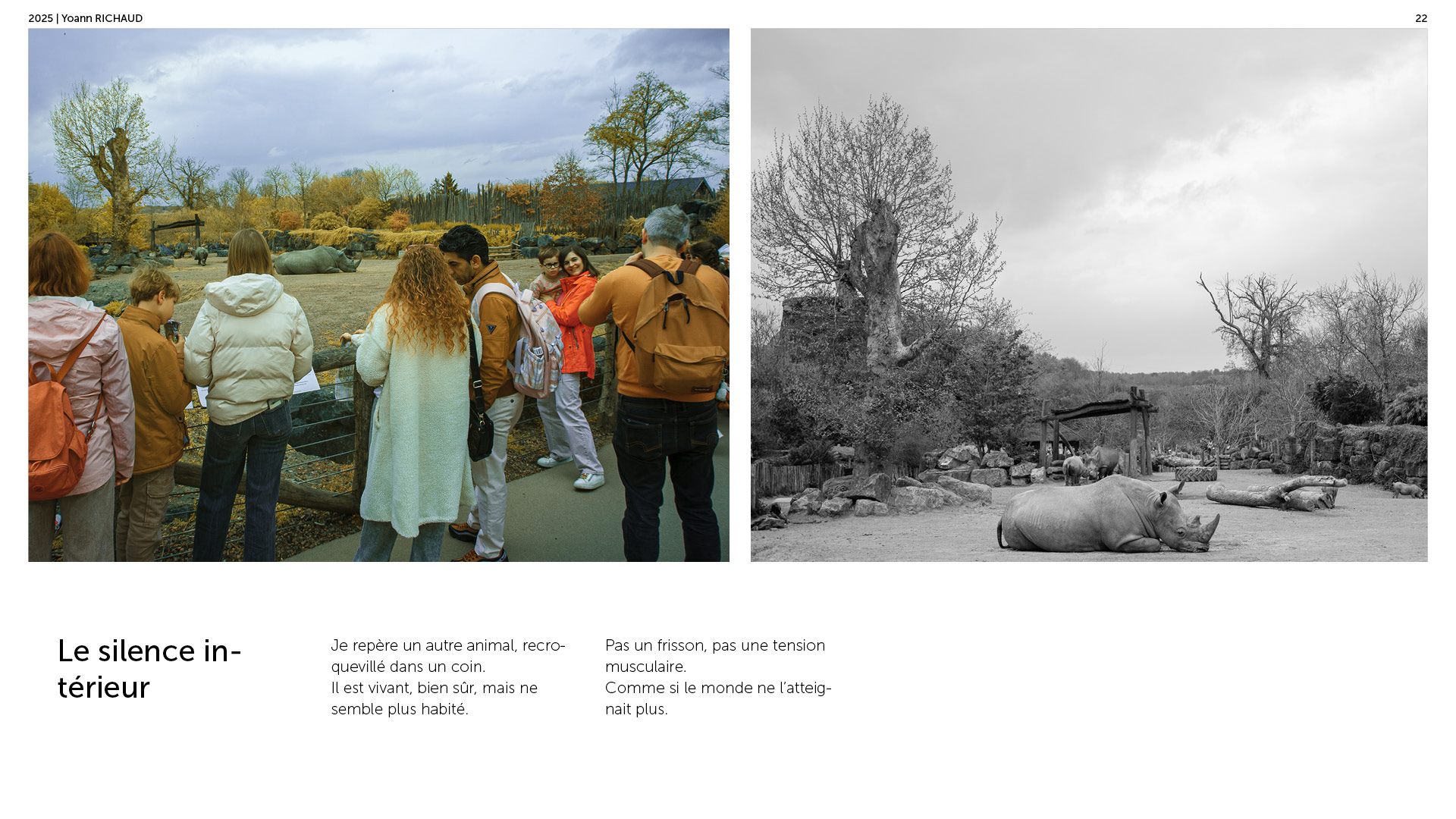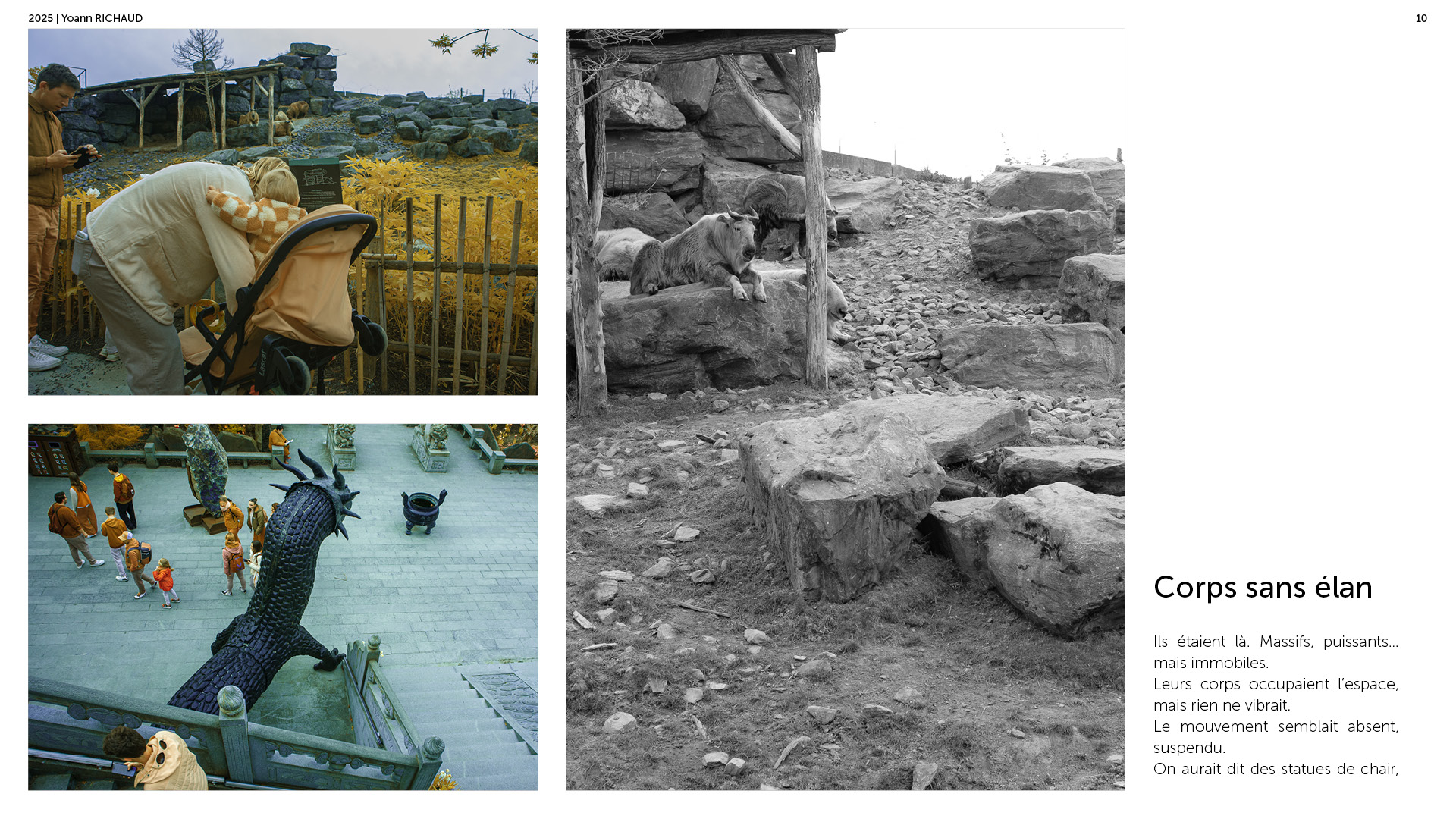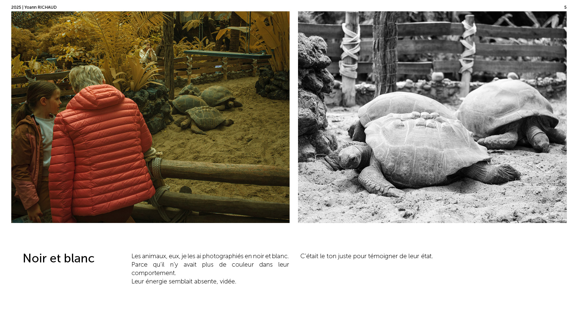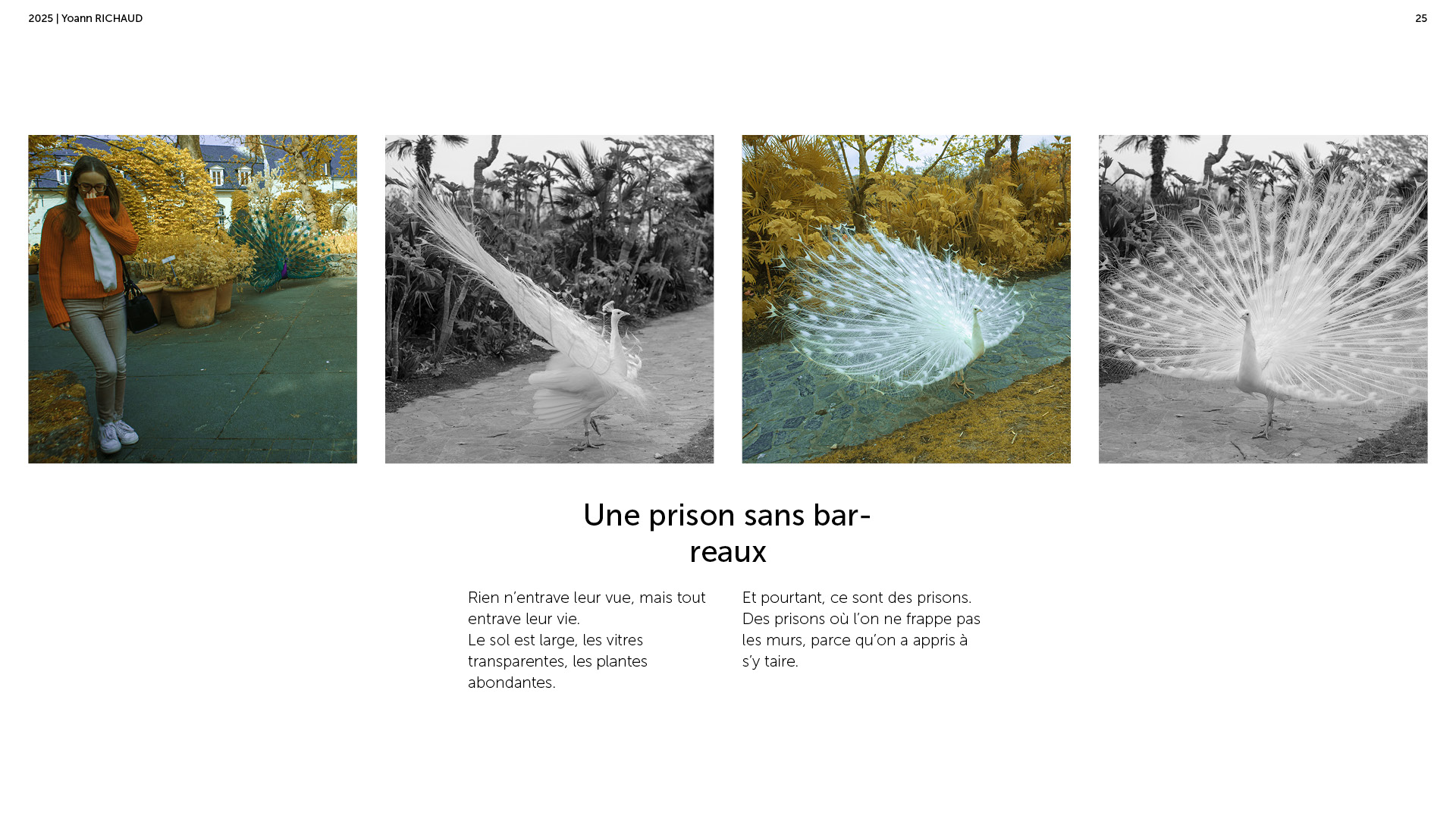 Photographe à Metz Cette série photographique réalisée au parc Pairi Daiza explore le contraste entre l’enfermement animal et l’indifférence humaine. Entre images en noir et blanc et vues en infrarouge, elle souligne deux réalités parallèles : celle d’animaux figés, et celle de visiteur·euses absorbé·es, détaché·es du vivant. En adoptant une esthétique soignée, ce projet invite à repenser notre rapport aux zoos et à notre façon de regarder.
