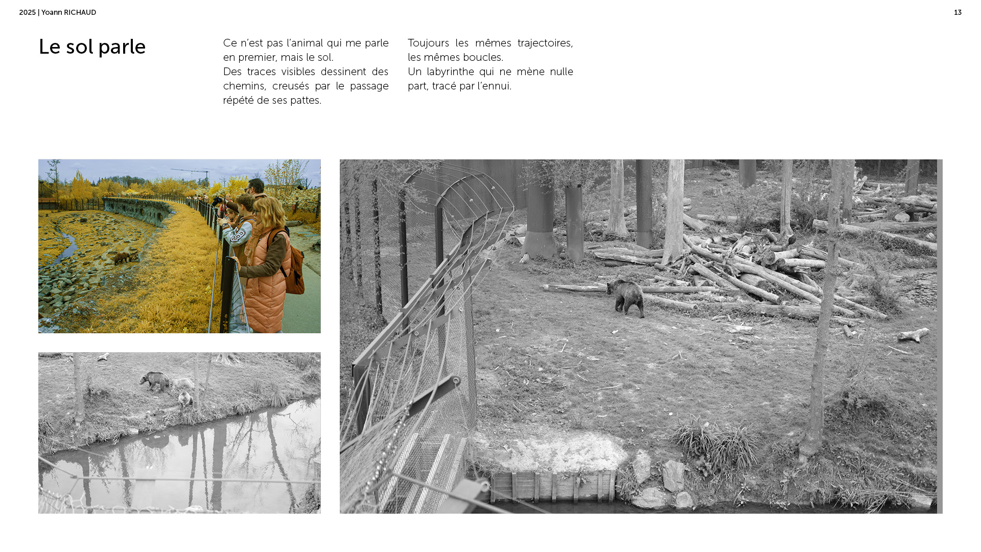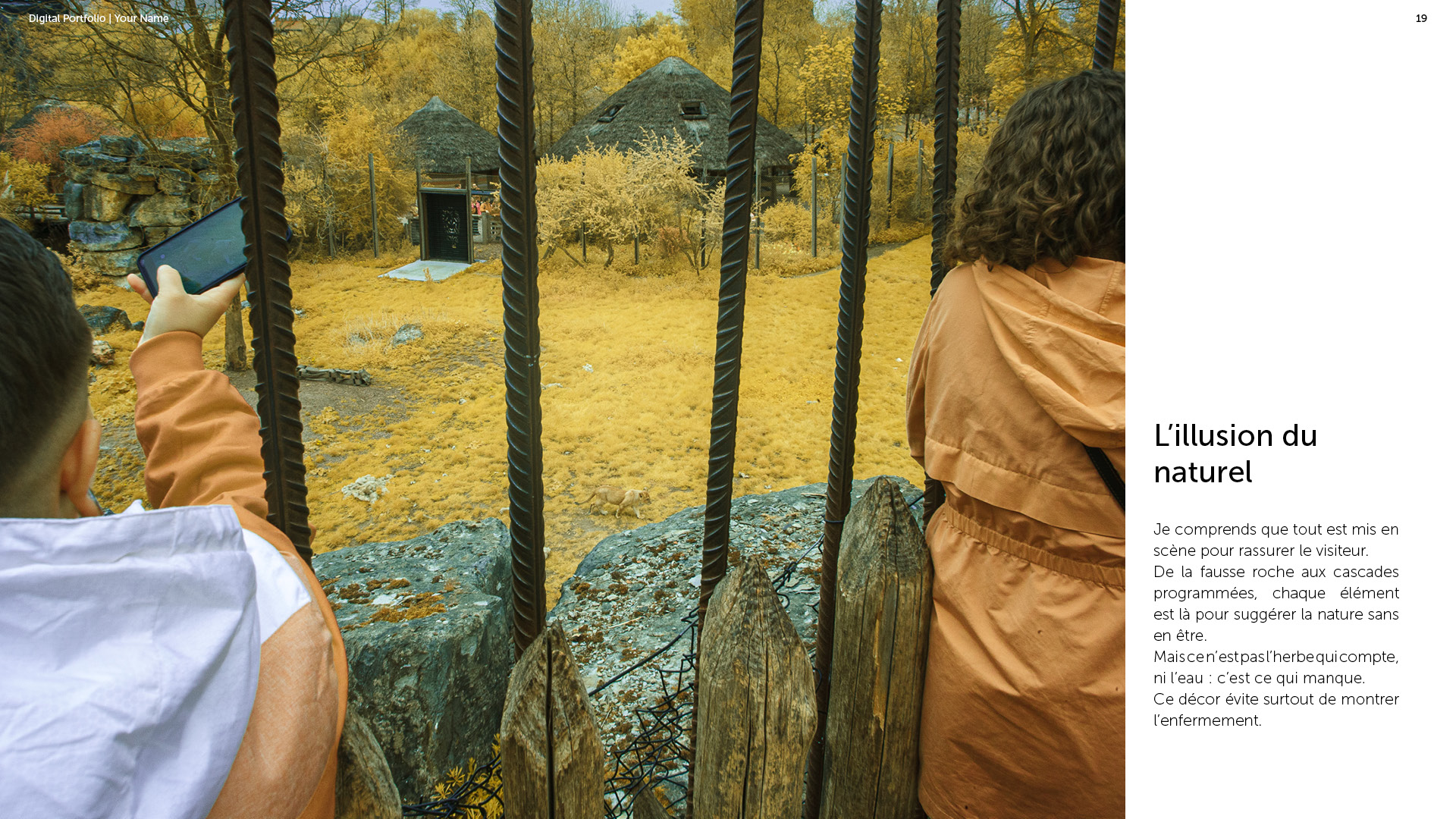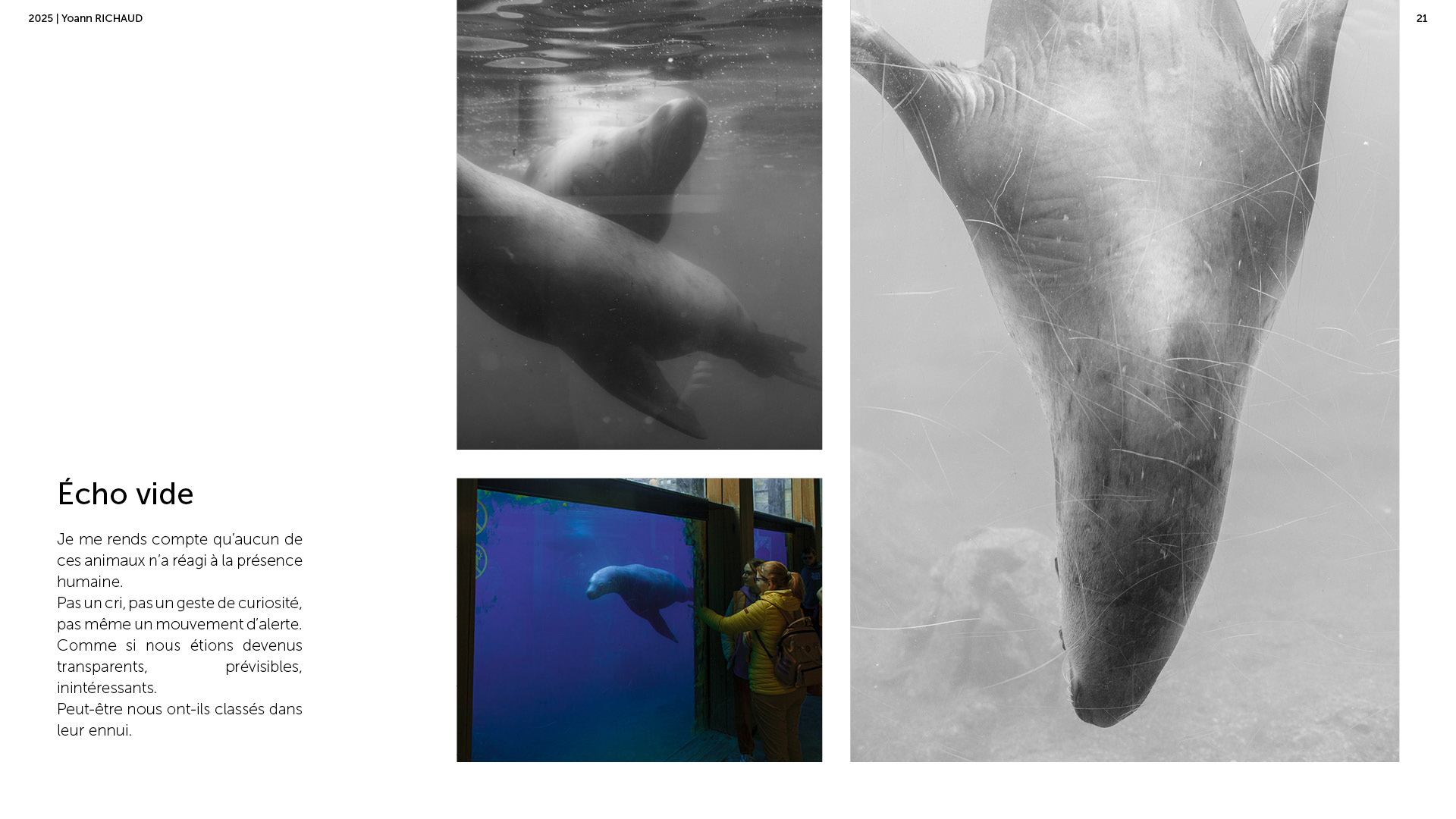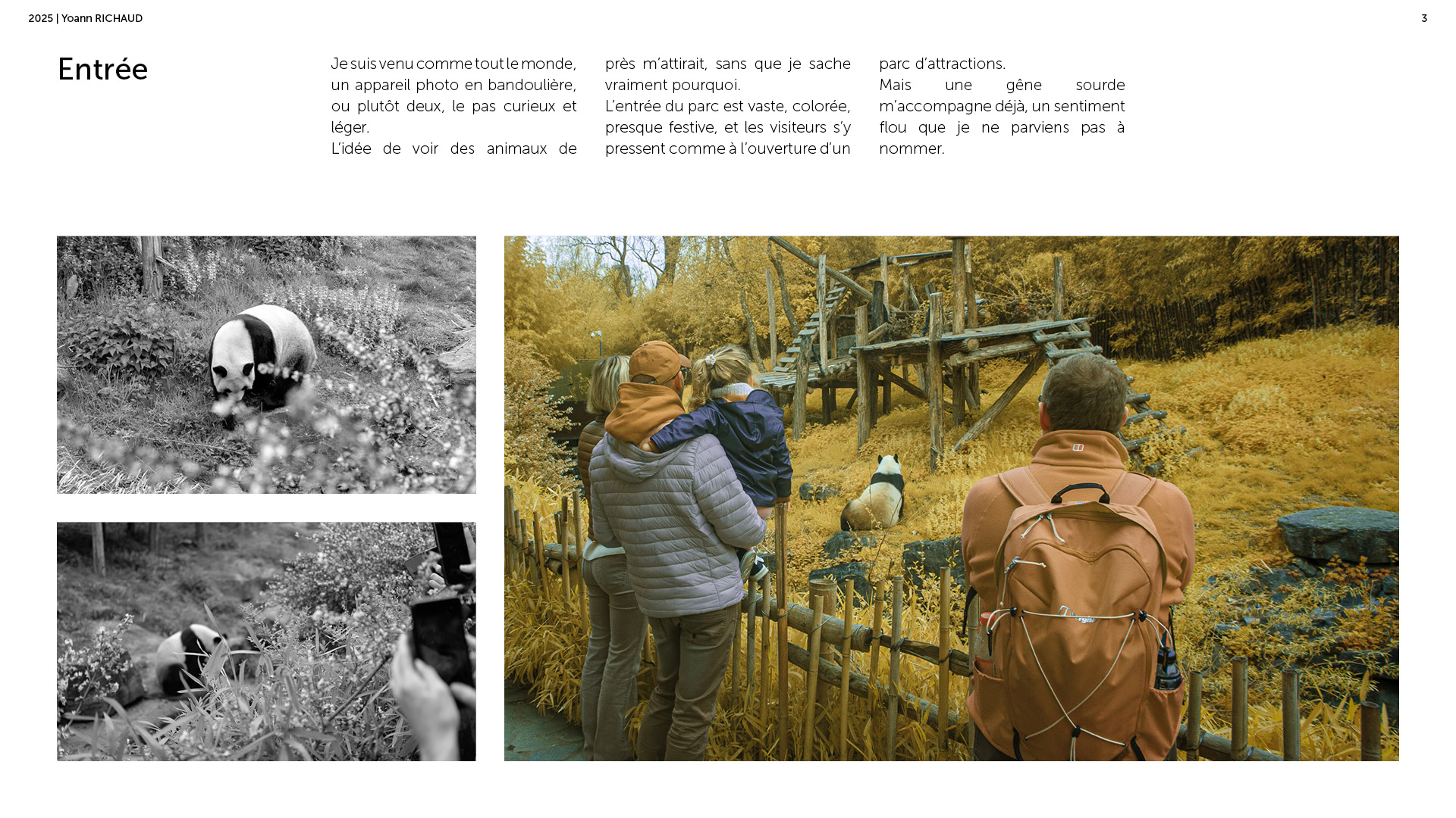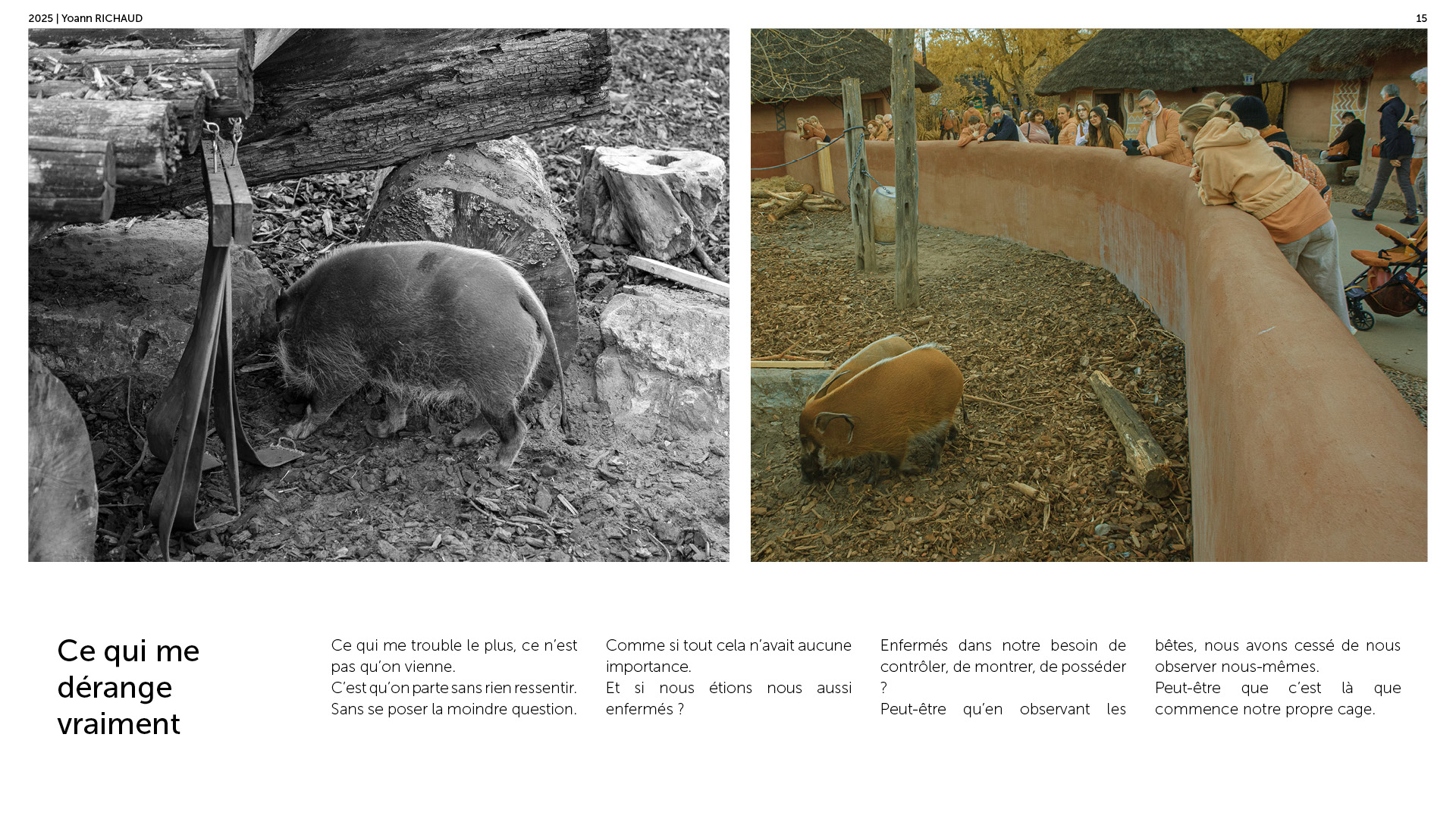 Photographe à Metz Cette série photographique réalisée au parc Pairi Daiza explore le contraste entre l’enfermement animal et l’indifférence humaine. Entre images en noir et blanc et vues en infrarouge, elle souligne deux réalités parallèles : celle d’animaux figés, et celle de visiteur·euses absorbé·es, détaché·es du vivant. En adoptant une esthétique soignée, ce projet invite à repenser notre rapport aux zoos et à notre façon de regarder.