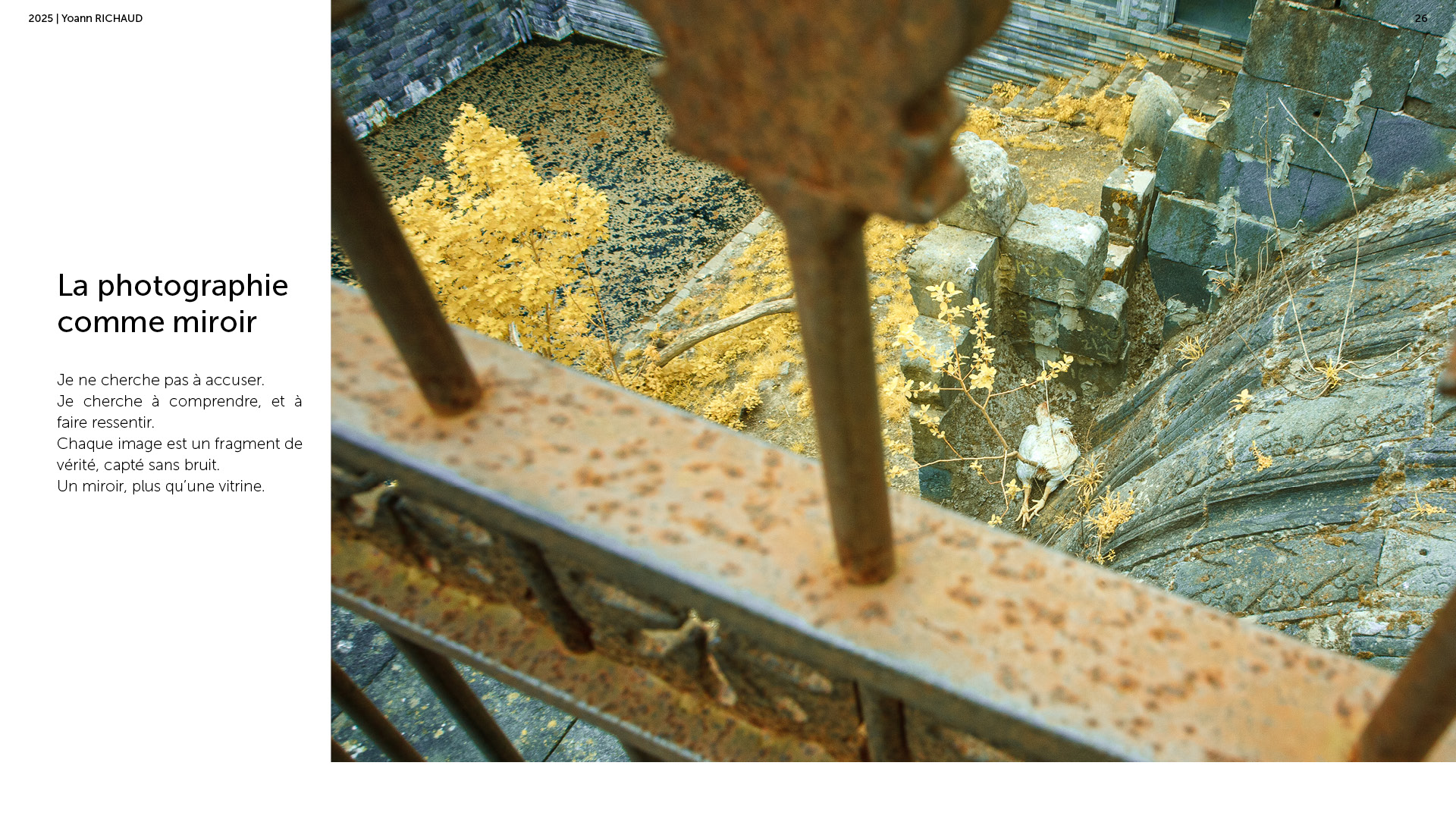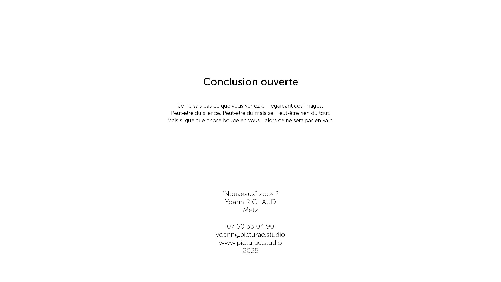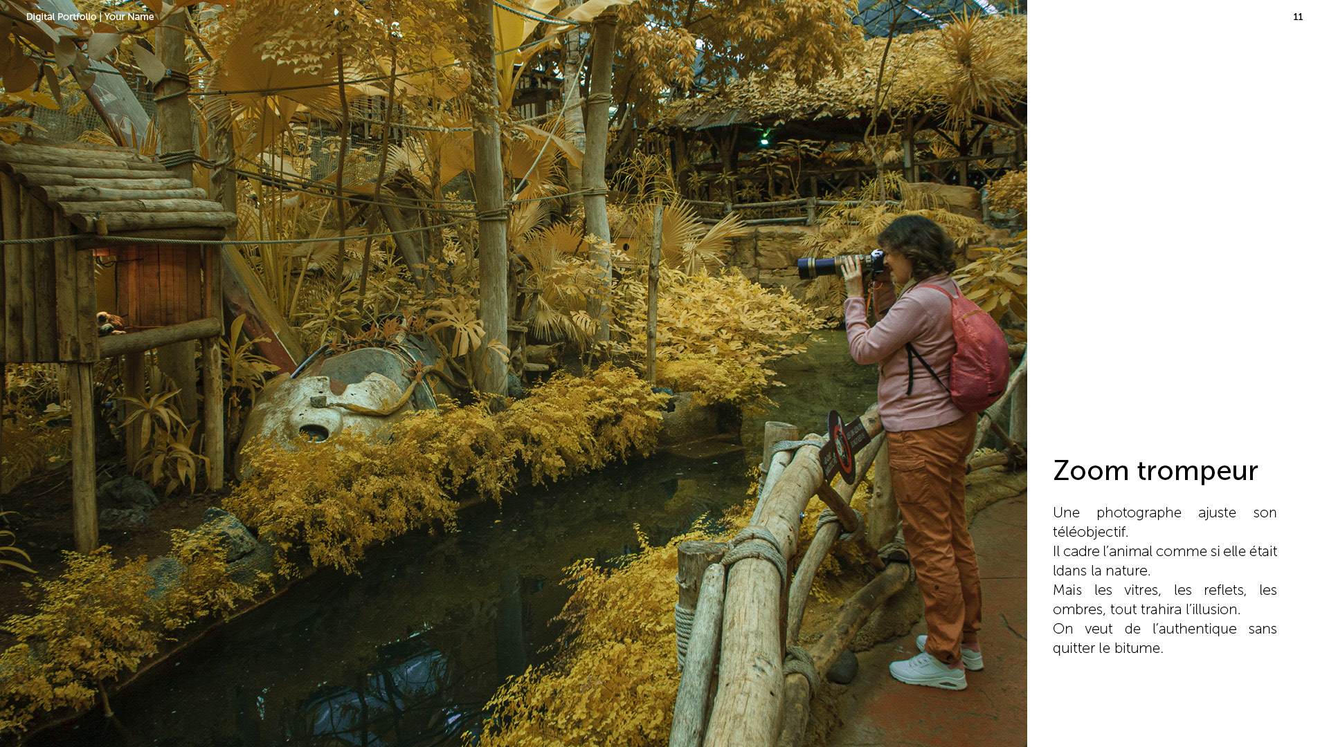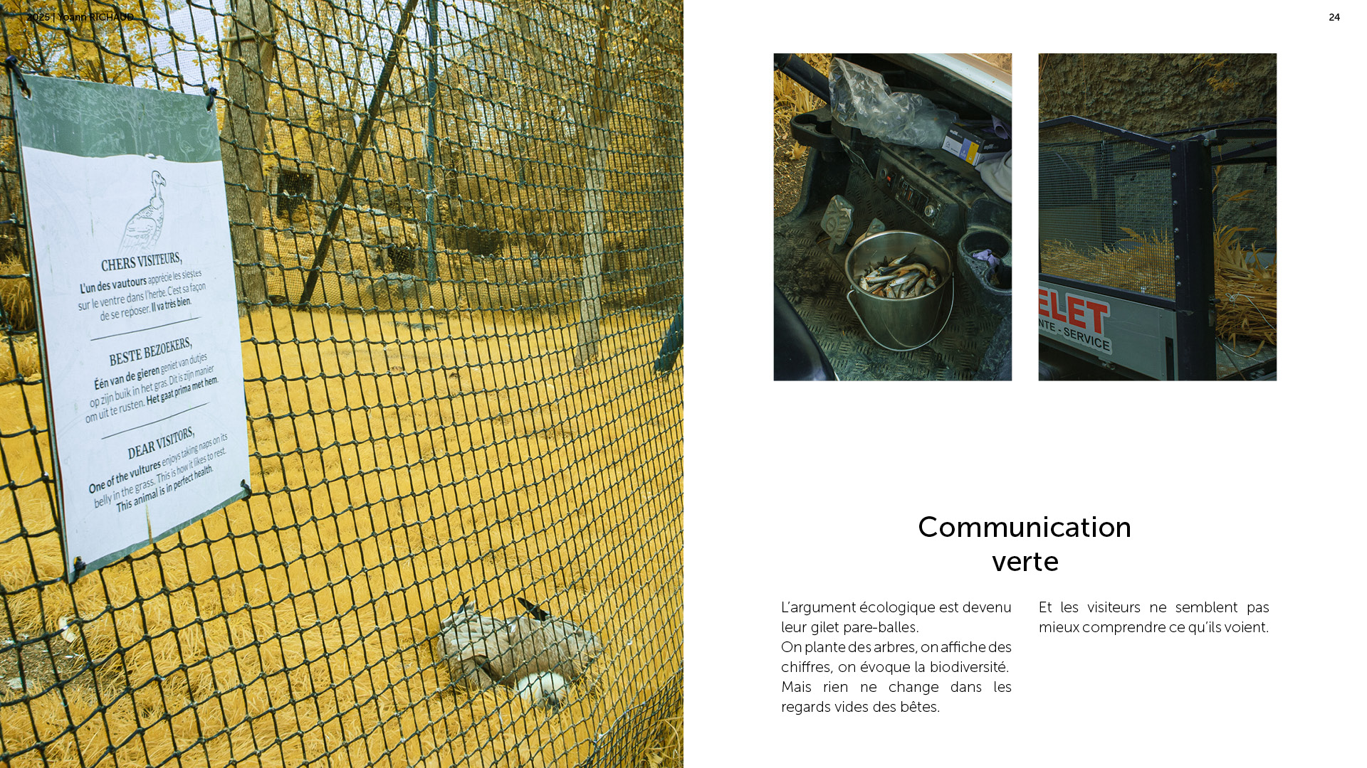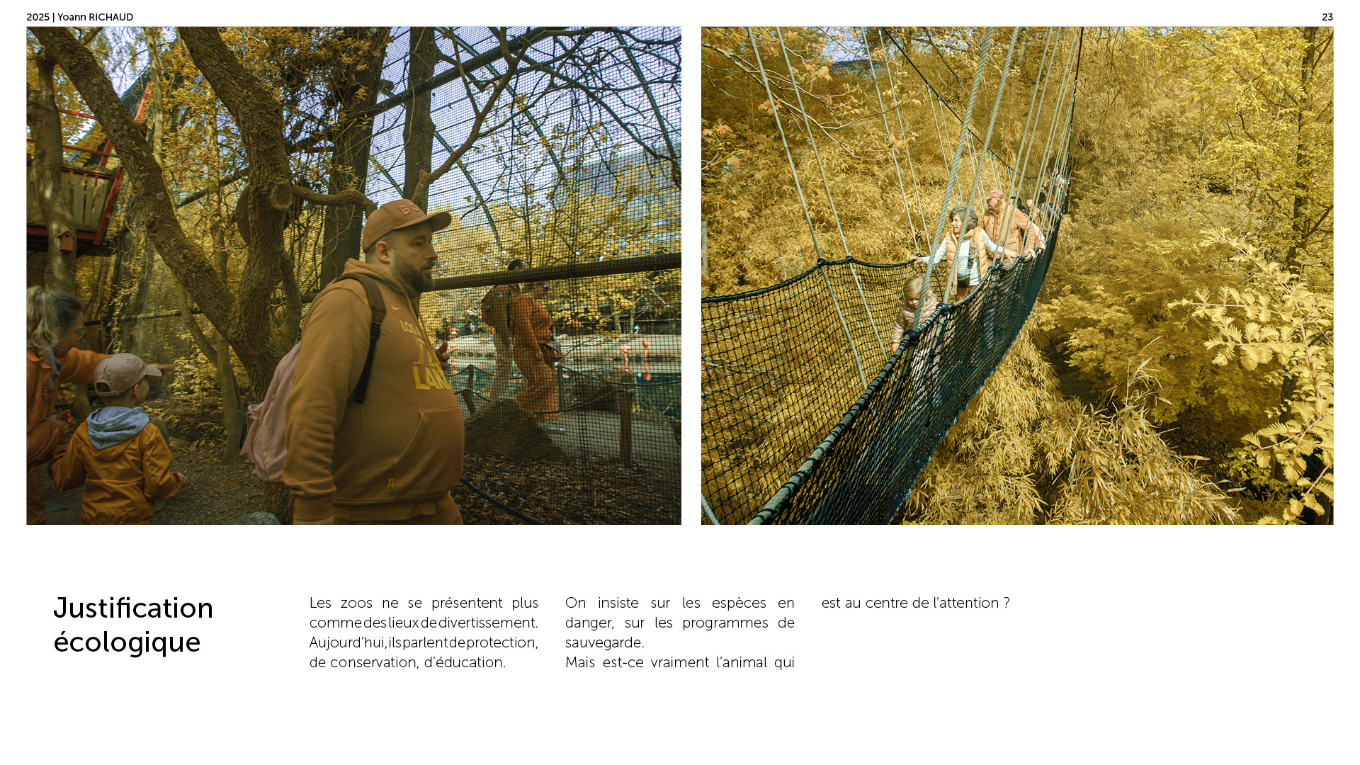 Photographe à Metz Cette série photographique réalisée au parc Pairi Daiza explore le contraste entre l’enfermement animal et l’indifférence humaine. Entre images en noir et blanc et vues en infrarouge, elle souligne deux réalités parallèles : celle d’animaux figés, et celle de visiteur·euses absorbé·es, détaché·es du vivant. En adoptant une esthétique soignée, ce projet invite à repenser notre rapport aux zoos et à notre façon de regarder.